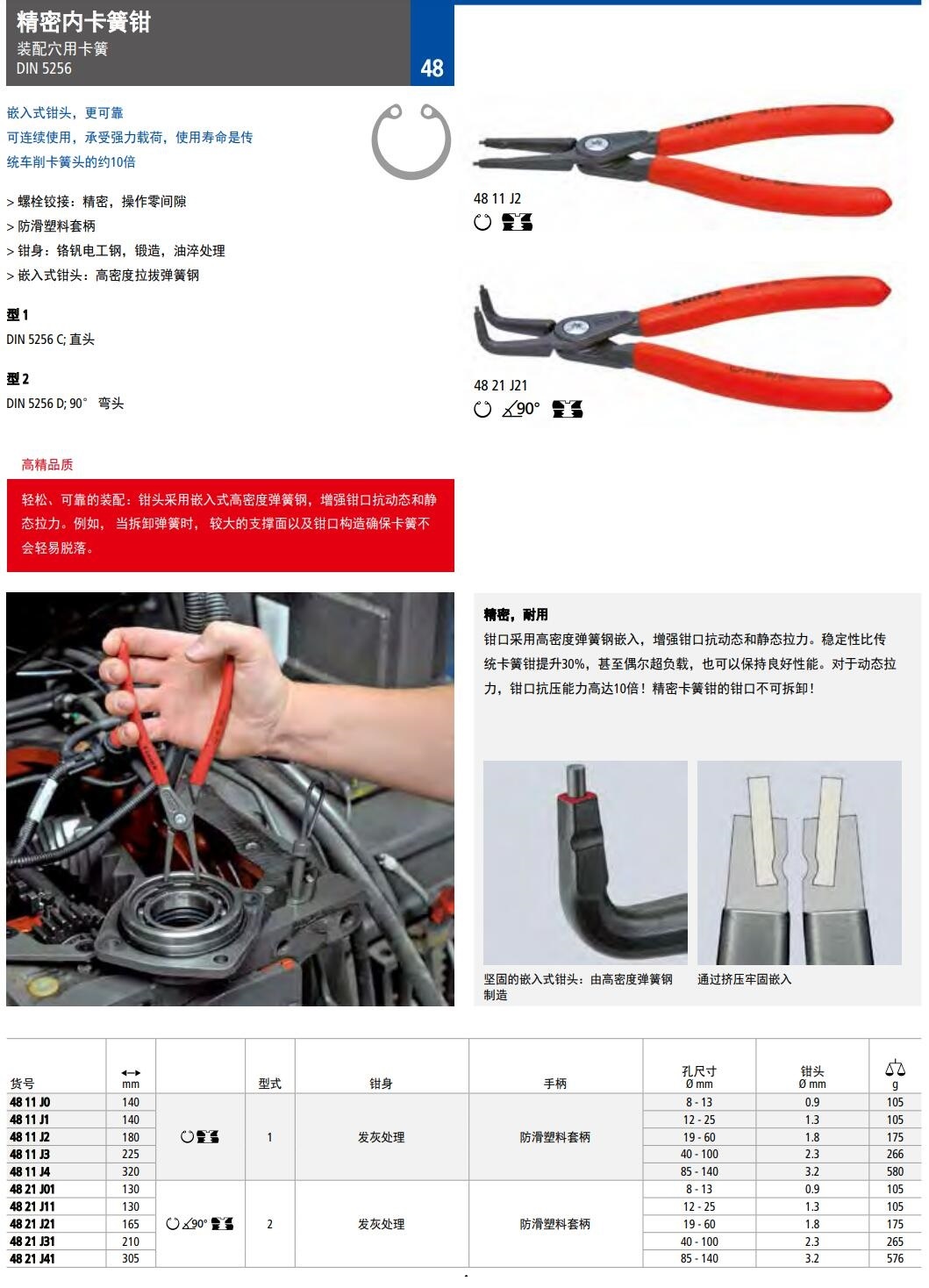 精密内卡簧钳嵌入式钳头,更可靠 可连续使用,承受强力载荷,使用寿命是传 统车削卡簧头的约10倍> 螺栓铰接:精密,操作零间隙> 防滑塑料套柄> 钳身:铬钒电工钢,锻造,油淬处理> 嵌入式钳头:高密度拉拔弹簧钢