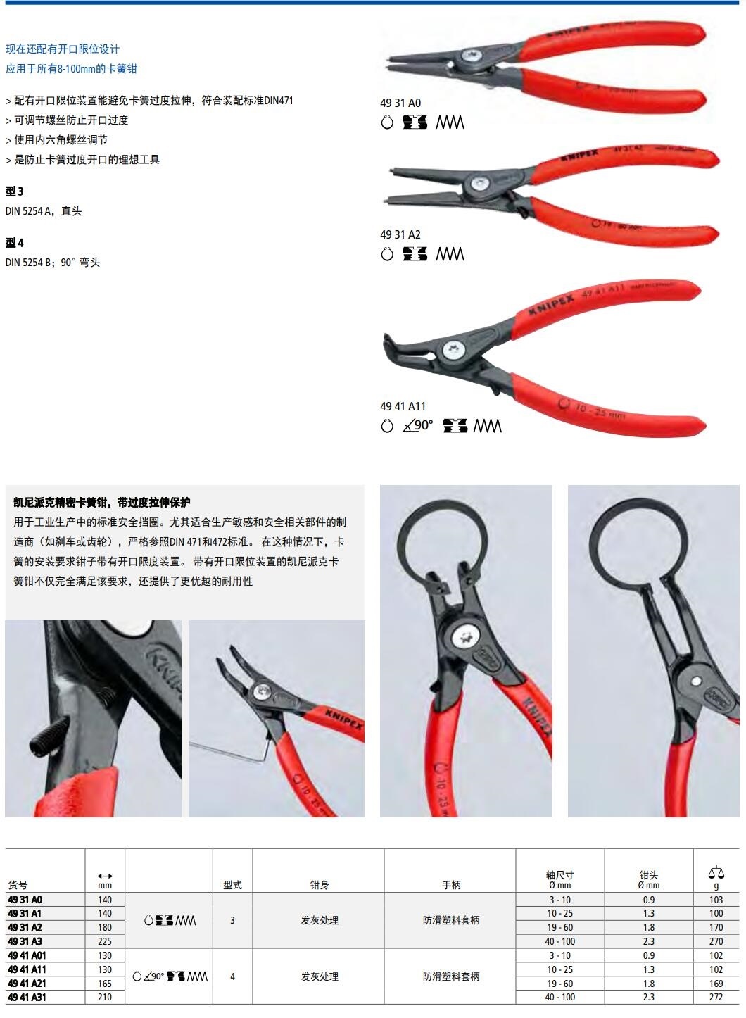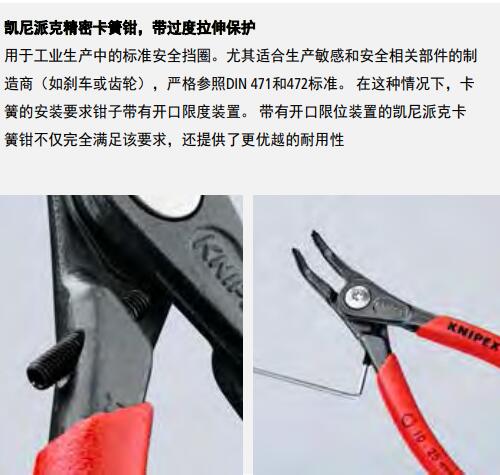 带限位精密外卡簧钳配有开口限位设计 应用于所有3-100mm的卡簧钳> 配有开口限位装置能避免卡簧过度拉伸,符合装配标准 DIN471> 可调节螺丝防止开口过度> 使用内六角螺丝调节> 是防止卡簧过度开口的理想工具