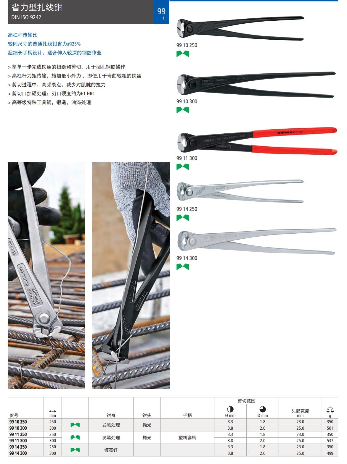 省力型扎线钳 DIN ISO 9242高杠杆传输比 较同尺寸的普通扎线钳省力约25%超细长手柄设计,适合伸入较深的钢筋作业> 简单一步完成铁丝的扭绕和剪切,用于捆扎钢筋操作> 高杠杆力矩传输,施加最小外力 ,即便用于弯曲较粗的铁丝> 剪切过程中,高频衰点,减少对肌腱的拉力> 剪切口加硬处理;刃口硬度约为61HRC> 高等级特殊工具钢,锻造,油淬处理