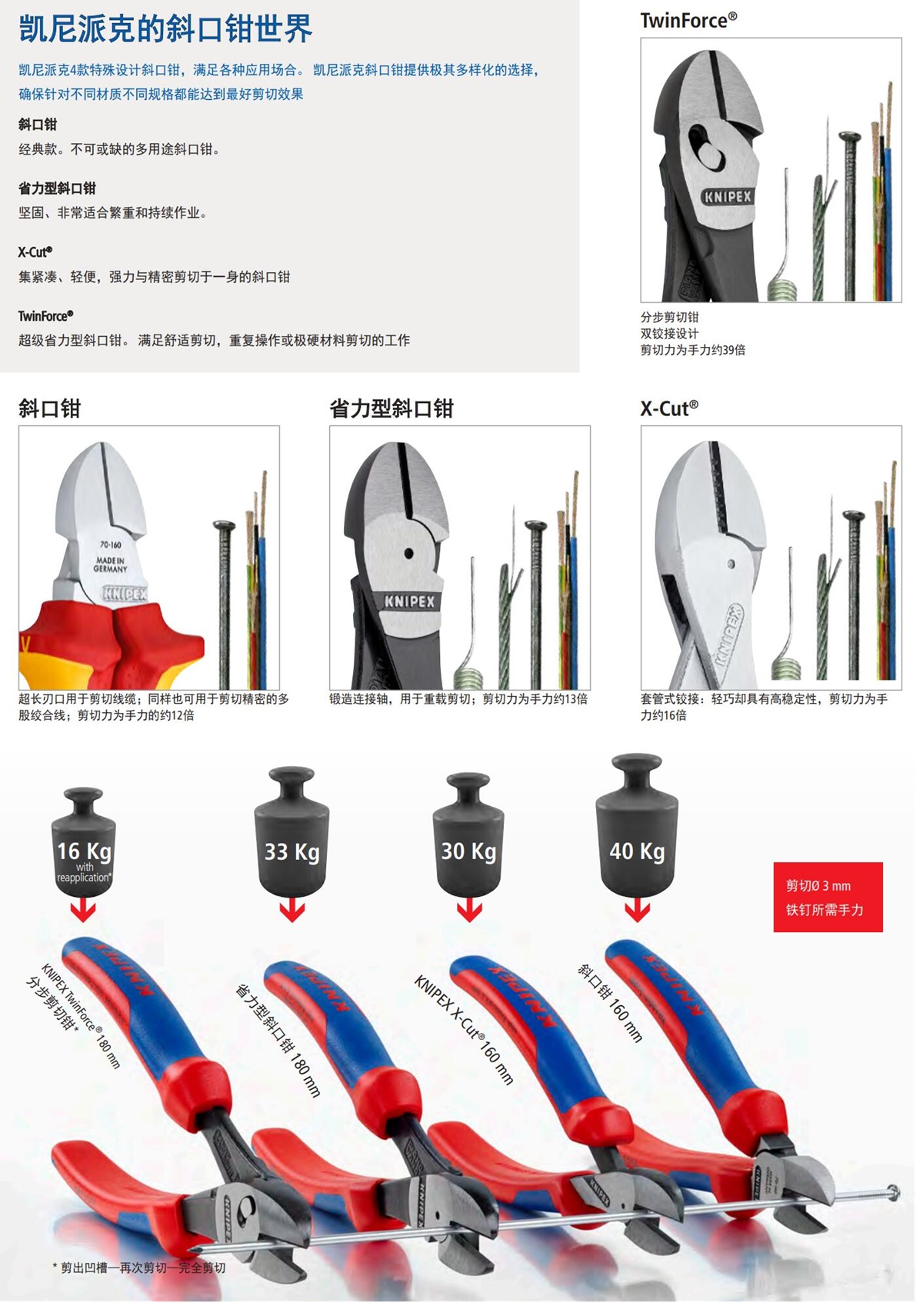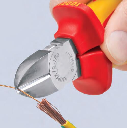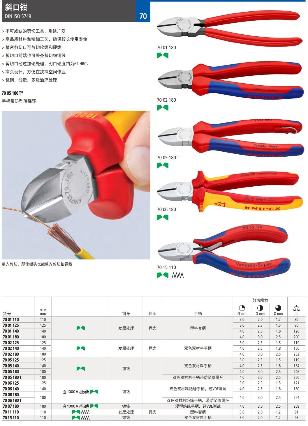 斜口钳 DIN ISO 5749> 不可或缺的剪切工具,用途广泛> 高品质材料和精细工艺,确保较长使用寿命> 精密剪切口可剪切软线和硬线> 剪切口前端也可整齐剪切细铜线> 剪切口经过加硬处理,刃口硬度约为62 HRC。> 窄头设计,方便在狭窄空间作业> 钒钢,锻造,多级油淬处理