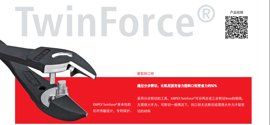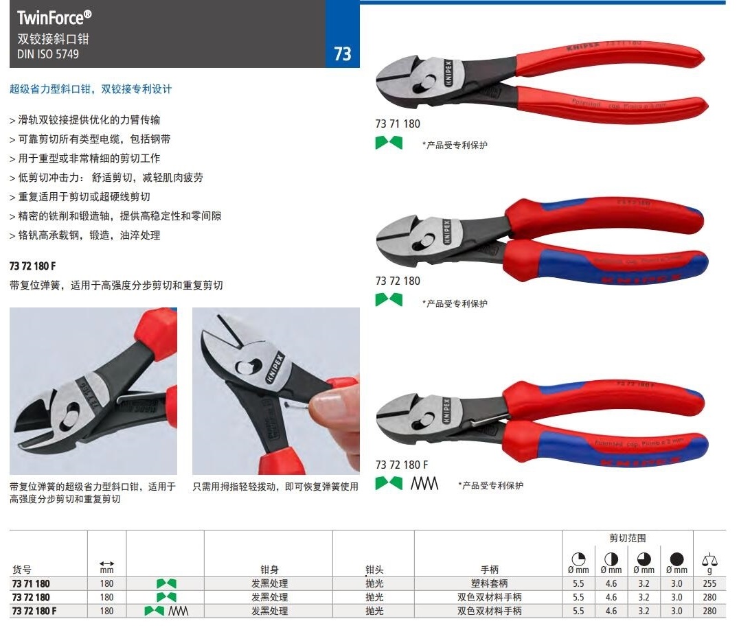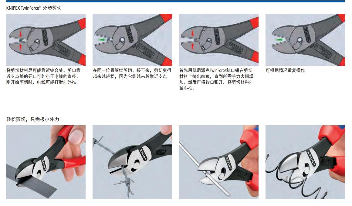 TwinForce®双铰接斜口钳 DIN ISO 5749超级省力型斜口钳,双铰接专利设计> 滑轨双铰接提供优化的力臂传输> 可靠剪切所有类型电缆,包括钢带> 用于重型或非常精细的剪切工作> 低剪切冲击力:舒适剪切,减轻肌肉疲劳> 重复适用于剪切或超硬线剪切> 精密的铣削和锻造轴,提供高稳定性和零间隙> 铬钒高承载钢,锻造,油淬处理