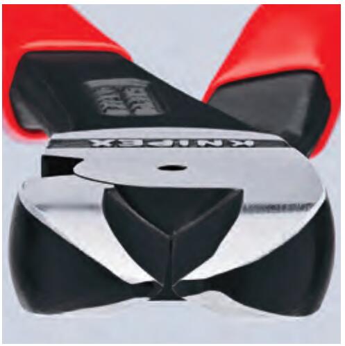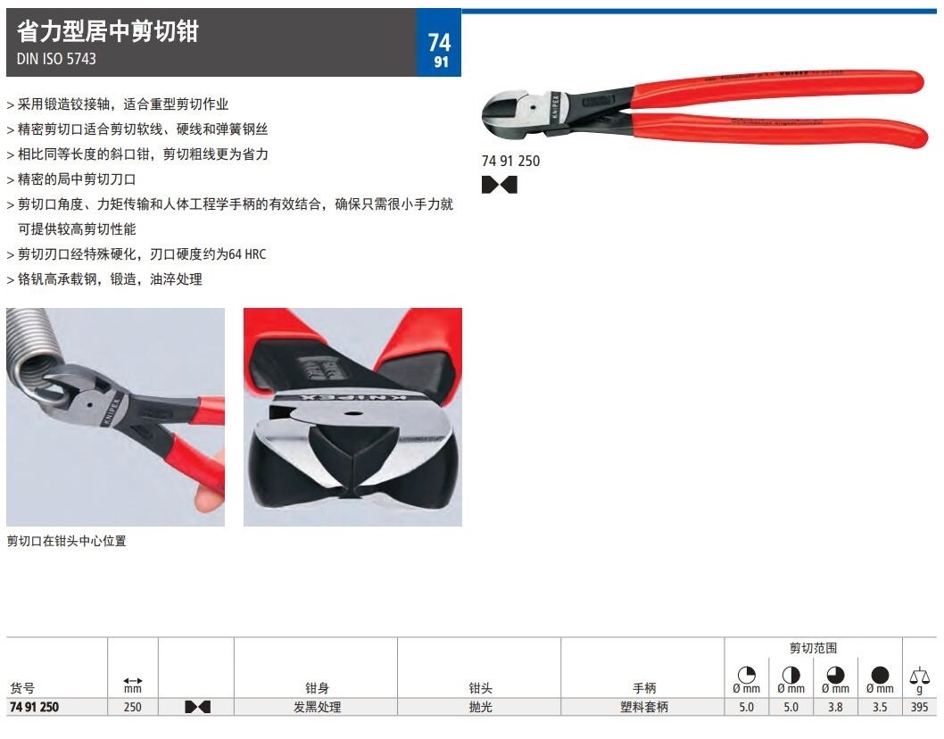 省力型居中剪切钳 DIN ISO 5743> 采用锻造铰接轴,适合重型剪切作业> 精密剪切口适合剪切软线、硬线和弹簧钢丝> 相比同等长度的斜口钳,剪切粗线更为省力> 精密的局中剪切刀口> 剪切口角度、力矩传输和人体工程学手柄的有效结合,确保只需很小手力就可提供较高剪切性能> 剪切刃口经特殊硬化,刃口硬度约为64HRC> 铬钒高承载钢,锻造,油淬处理
